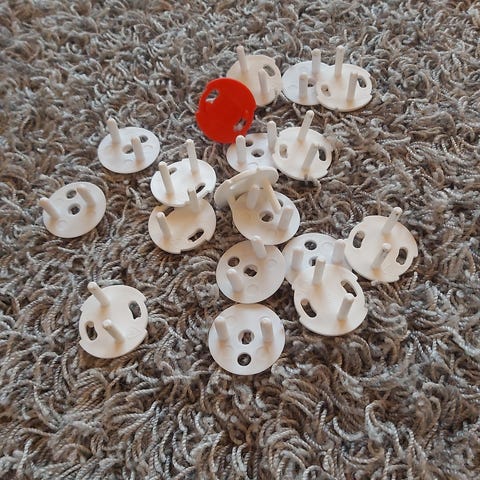 Avattu paketti, jäljellä 6 kpl käyttämätöntä pistorasiasuojaa, kiertomekanismi, valkoista muovia.
