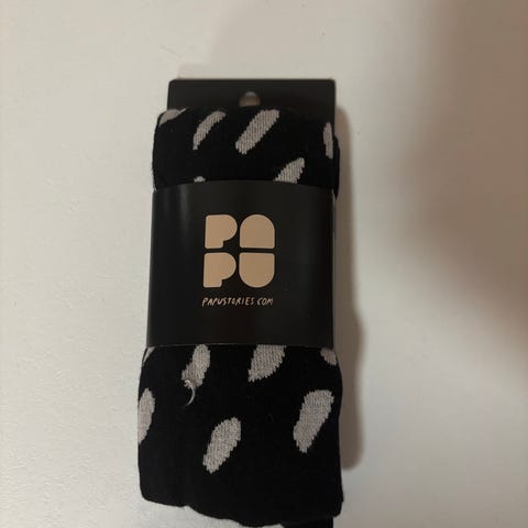 Papu merkin puuvillaneuloshousut, koossa 110/116, mutta meidän perheen kokemuksella erittäin reilu mitoitus (resorit).