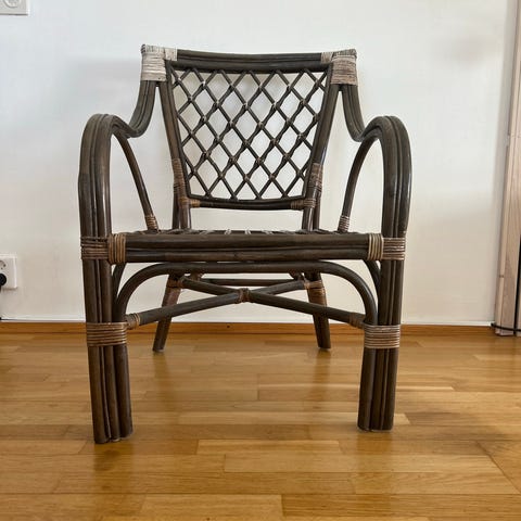 Hyväkuntoinen rottinkituoli, johon tulee mukaan pehmuste. Toinen puoli musta, toinen harmaa. Käsinojat ja jalat joskus maalattu valkoisiksi. Nouto Raisiosta.