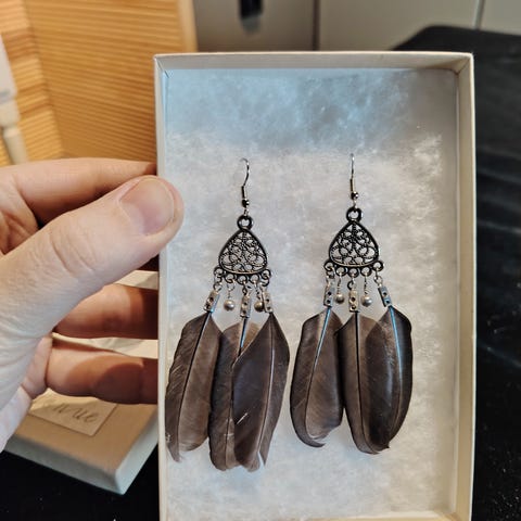 Myydään uudet käyttämättömät Vuonue valkoiset maatiaiskanan höyhenkorvakorut. Koukku nikkelitön. Höyhenen pituus 5 cm.