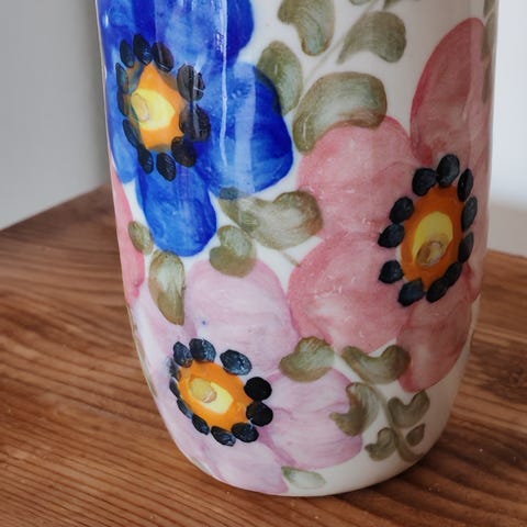 Käsinmaalattu koristeellinen maljakko, jossa on kukka-aiheinen kuviointi. Valmistettu posliinista, tämä maljakko sopii erinomaisesti sisustuselementiksi. Sen yksityiskohtainen muotoilu ja värikäs ulkonäkö tekevät siitä houkuttelevan lisän mihin tahansa huoneeseen.