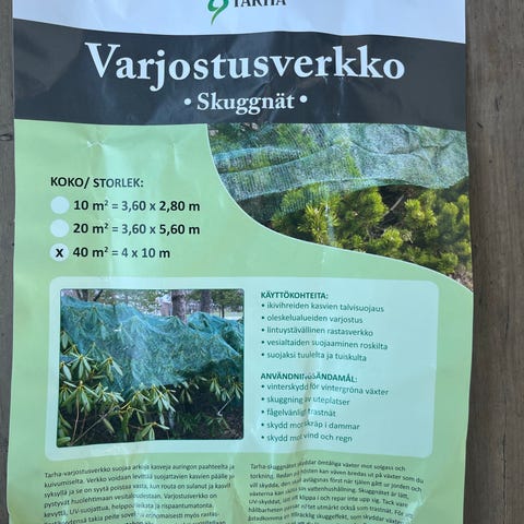 Varjostusverkko tuija-aidan suojaukseen kevätauringolta n. 4 x 50 metriä. Leikattu useampaan palaan leveyssuunnassa. Varjostusaste 50%. Mukaan tulee myös muutama sekalainen verkon pala. Nouto Järvenpäästä.