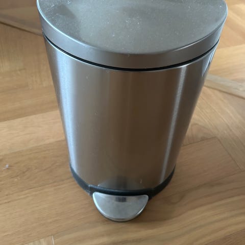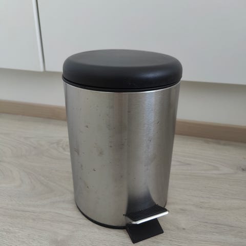 Hyväkuntoinen, ulkopinta täydellinen. Pientä viirua astian pohjalla. Poljin roskakori. Kromin väristä metallia ja mustaa muovia. Korkeus 45 cm, syvyys/leveys 30 cm.