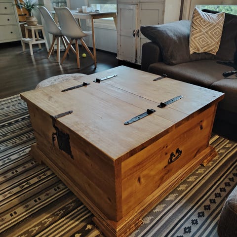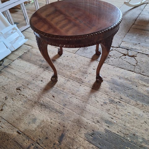 Vanha chippendale sohvapöytä. Pöydän pintalakka on krakeloitunut ja osoittaen irronnut. Alla oleva viilu ehjä