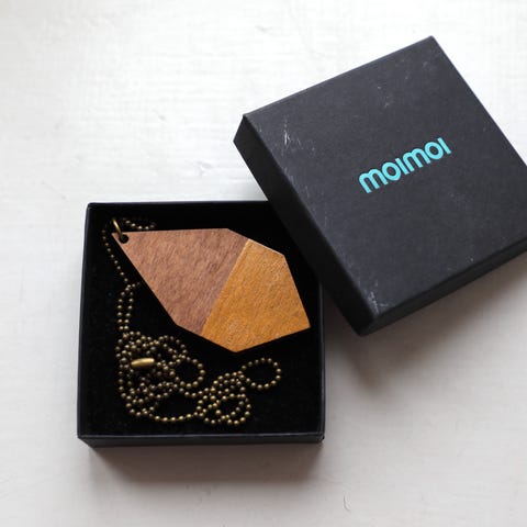 Myydään moimoi:n viilupuinen ankkuri kaulakoru. Toisella puolella ankkuria on moimoi logo.