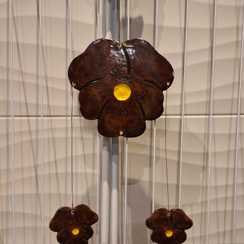 Tämä on todella kaunis. Kokonaispituus n. 41cm. Alimmassa orvokissa lenkki, mahdollisesti siinä on roikkunut esim puuhelmi. Yksi pieni valkea kohta, näkyy kuvassa. Ei merkintöjä. Nouto Iittala HML tai postitus.