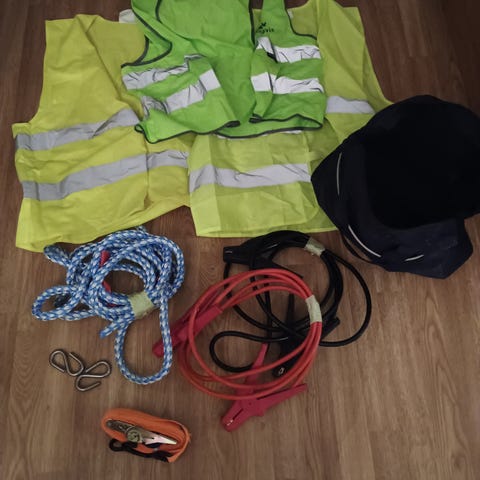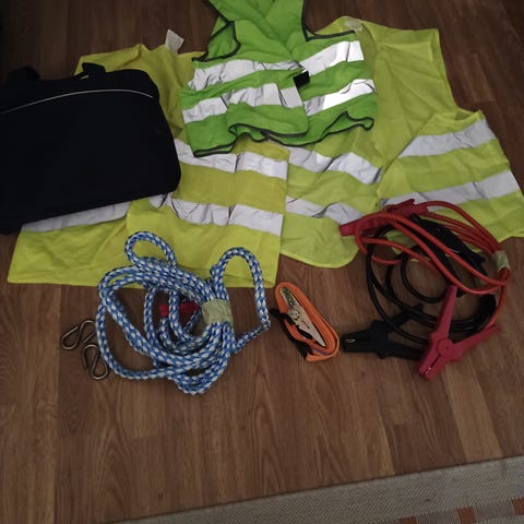 Käyttämätön hätäpakkaus sisältää heijastinliivin, hanskat, lapion, taskulampun ja pelastuspeitteen.