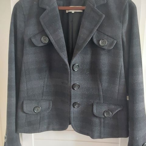 Koko M. 65% villa, 35% polyesteria. Kai-kai 54, olka-helma 71. Suora malli. Harmaa. Päälletaskut. Ei vuorta. Kevyt ja mukava päällä