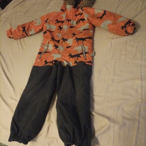 Oikein hyväkuntoinen 110cm välikausihaalari. Lassietec merkkinen. Kangas oikein hyvä kuntoinen muutoin mutta polvien kohdalla pientä pehmentymää. Jalkalenksut puuttuu, mutta molemmat napit tallessa.