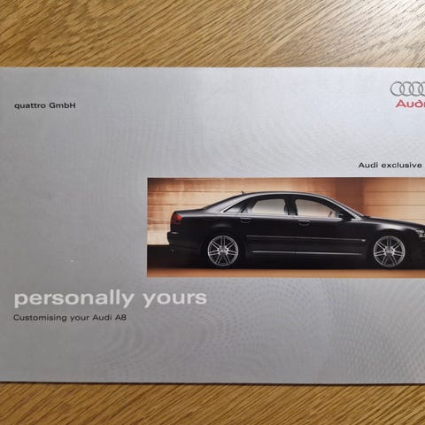 Hieno ja harvinainen, vuonna 1996 painettu kaksiosainen myyntiesite koskien Audi A8 autoa. Upeita aukeamakuvia, tekniset tiedot, värivaihtoehdot ym.