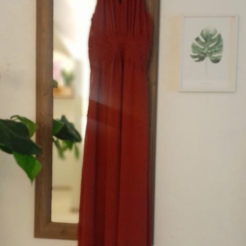 Yhdet juhlat juhlittu Vilan maksimekko koossa 34. Väri burgundy, takana piilovetokeju ja niskassa hakaset.