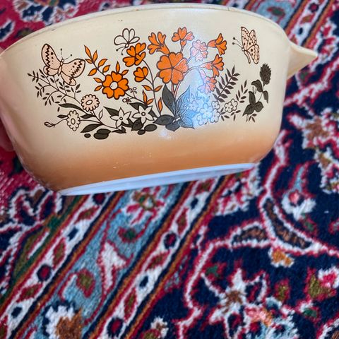 Vuoan mitat sisältä: 21x27cm (+kahvat). Sisäkorkeus 7,5cm. Kunto: hyvä – värit kirkkaat ja kuviot terävät. Kannessa muutama pieni pintanaarmu ja kyljessä myös muutamia pintanaarmuja, ei syviä jälkiä eikä lohkeamia. Sopii niin käyttöön uunissa kuin kauniiksi sisustusesineeksi avohyllyyn. Kestävää lasia, joka on säilynyt jo yli 50 vuotta. Hyvä lisä Pyrex-kokoelmaan tai retrohenkiseen keittiöön.