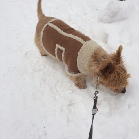 Jackrussellinterrierillä ollut muutaman kerran päällä. Siisti, lämmin, karvakaulus, fleecevuorillinen, vettähylkivä päällyskangas. Hyväkuntoinen edelleen.