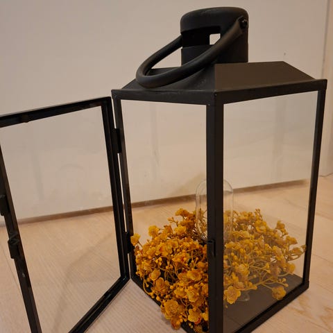 Puuhun upotettu liekkilamppu, joka jäljittelee oikeaa tulta. Korkeus 25cm ja halkaisija 12cm.