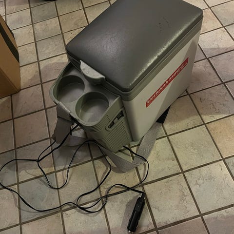 Verkkovirtapiuha mukana, 12V piuha ei mukana. Kannessa/ovessa pienehköt lokerot molemmin puolin johtojen säilytykseen tms). Toimii joko jää-/viileäkaappina taikka lämpökaappina.
