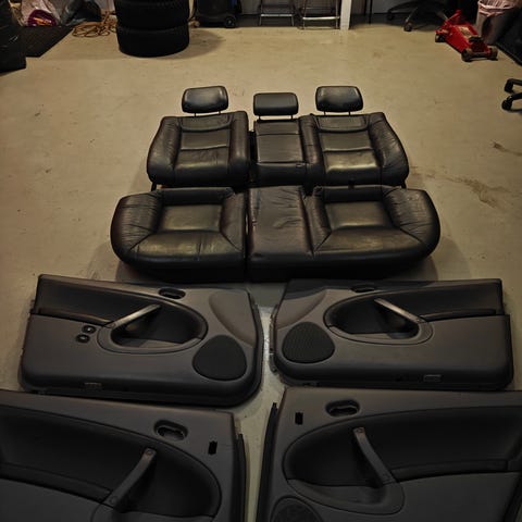Siistikuntoinen ja ehjä nahkasisusta, purettu OG9-5 farmarista. Täydellinen setti: Penkit, oviverhoilut, kyynärnoja ja takapenkit sivutyynyt. Ehjä ja hyväkuntoinen setti. Ainoastaan nouto.