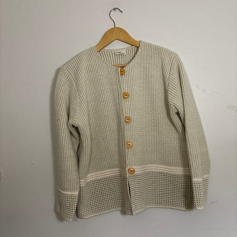 Myydään Vero Moda -neuletakki kokoa XL. Valkoinen punaisilla ohuilla raidoilla. Taskut edessä.