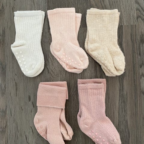 6 parin sukkasetti, joista 5 paria on uusia. Keltaisia on käytetty kahdesti rattaissa. Kaikki pesty hajusteettomalla vauvanpesuaineella. Puhtaat.