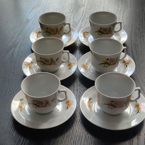 Seitsemänosainen Saksan(DDR) Ilmenau, Graf von Henneberg kahviastiasto, vintage posliinia. Täysin ehjä, krakeloitumaton ja tahraton, kuin uusi. Leiman perusteella astiastoa valmistettu 1970-luvulla.