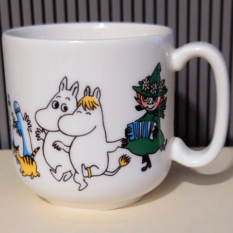 Myynnissä myös sarjan muki erillisessä ilmoituksessa. Katso kaikki ilmoitukset; mm Fazer muumimuki ja Muumipeikko unelmoi muumimuki.