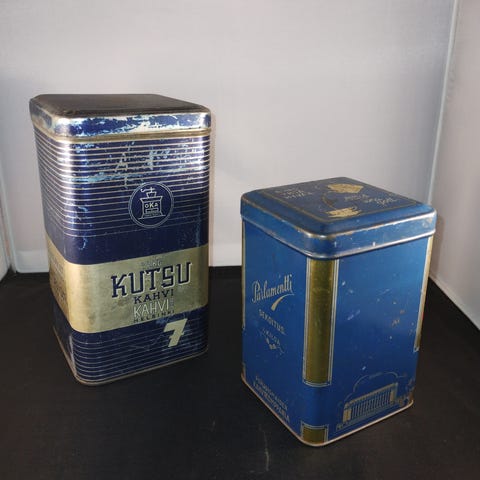 Kuvan peltinen kahvipurkki 1930-luvulta.
