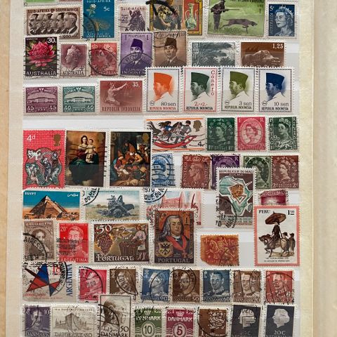 Kokoelma erilaisia postimerkkejä, joissa on monivärisiä ja historiallisia aiheita. Mukana on merkkejä eri maista ja aikakausilta, mikä tekee tästä kokoelmasta kiinnostavan filatelisteille. Merkit esittävät erilaisia teemoja, kuten historiallisia henkilöitä, rakennuksia ja taideteoksia. Sopii hyvin keräilyyn tai lahjaksi postimerkkien ystävälle.