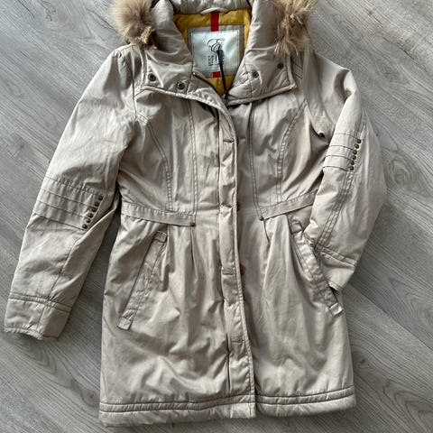 Lämmin, muutaman kerran käytetty, koon 36 talvitakki. Muuten täysin ehjä, mutta taskujen vetoketjut molemmin puolin jumittaa taskujen vuorikankaaseen. Huppu ei ole irrotettava.