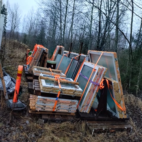 Myynnissä valmiiksi pakattuna rahtivalmiina olevat ikkunat. Aikanaan tilattu asiakkaalle, olivat mittavirheelliset eli eivät koskaan edes otettu paketista pois.