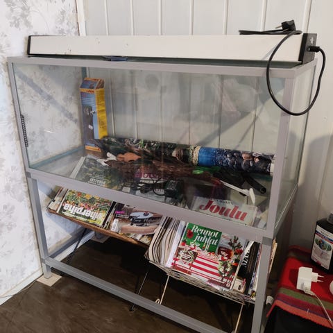 100 litrainen,noin vuoden vanha,akvaario. Mukaan suodatin,lämmitin,Lappo,taustapaperi. 100€