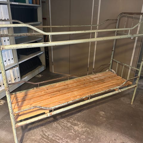Kuvan vanha lasten kerrossänky kehikko. Pohjalevyt puuttuu, mutta tukeva. Maali lohkeillut