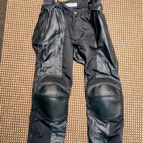 Huippulaadukkaat ruotsalaiset naisten ajohousut, yhdistelmä nahkaa ja tekstiiliä. Vedenpitävä Dryway-kalvo. Suojat on sekä lonkissa että polvissa. Kuvissa mittoja.