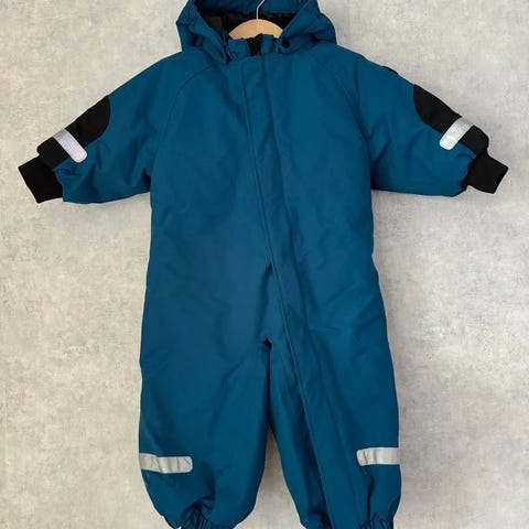 Petroolinsininen hyväkuntoinen toppapuku, koko 74. Jalkaklenksut on hieman kuluneet, mutta ehjät.