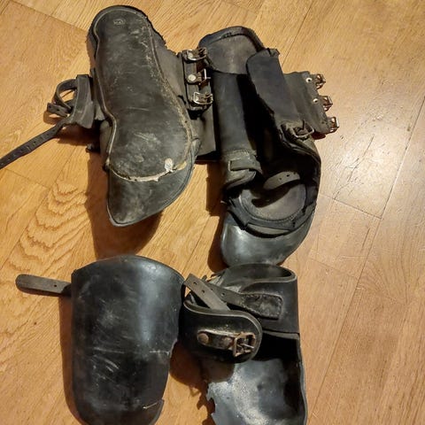 Finntackin säärisuojat takajalkoihin, koko L, väri musta. Ovh. 29-42 e. Käytössä olleet ravisuojat, joissa normaalissa käytössä tulleita pintanaarmuja (kts. kuva). Muuten oikein hyvässä kunnossa olevat suojat napakoilla tarroilla ja ehjällä sisävuorella. Kevyet läpättömät säärisuojat tarrakiinnityksellä. Valmistettu kestävästä muoviseoksesta ja niissä on lämmön vaikutuksesta hevosen jalan mukaisesti muotoutuva vaahtomuovivuori. Suojat on pesty (ei siltä näytä...), mutta olisivat näköjään vaatineet perusteellisempaa hinkkausta sisäpuolelta. Suojien korkeus 37 cm.