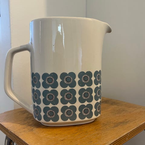 Ehjät hyväkuntoiset kannu ja kulho myyntiin tilaa viemästä. Kulhon pohjassa alapuolella näkyy viiru, ei tunnu sormeen eikä kun kynnellä rapsuttaa, on siis pinnoitteen alla.