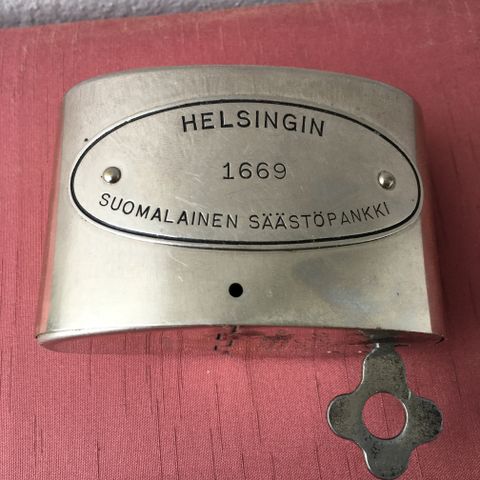 Vanha lukittava säästöpossu / "säästöputki" kolikoille, metallia. Putkessa lukee "Tömmes av Postsparbanken" eli "Tyhjennetään Postisäästöpankissa". Avain puuttuu. Putkessa ei ole kolikoita. Korkeus n. 7 cm, halkaisija n. 2 cm.