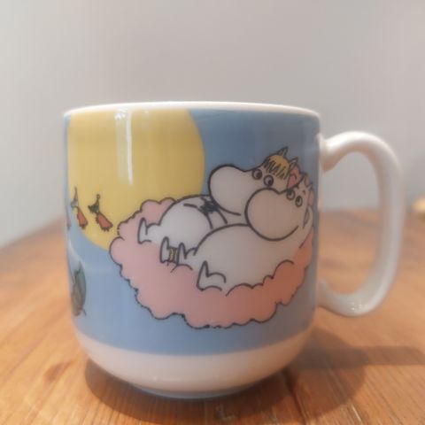 Hakusanat: arabia lastenastiat, ruokailuastiat, lapset, lasten muki, astiat, astioita, astiasto, posliinia, posliini, posliininen, kaksi kahvaa/korvaa, keltainen, muumit, muumimuki, niiskuneiti, teatteri, kruunuleima.