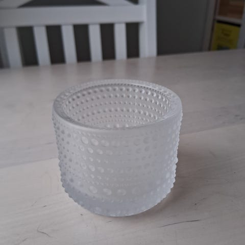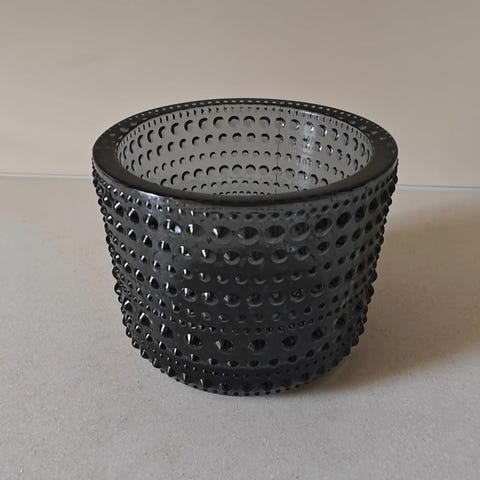 Melko tumman harmaa 64 mm Iittalan Kastehelmi-kynttilälyhty. Ostettu muutama vuosi sitten, joten en ole täysin varma, onko tämä se nykyinen harmaa. Tulee omassa laatikossaan, joskin laatikossa lukee sitruunankeltainen (tuli tässä myymälästä). Hinta myymälässä nyt 23,90€.