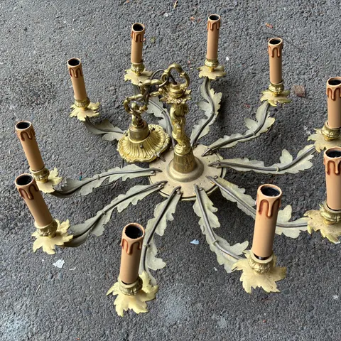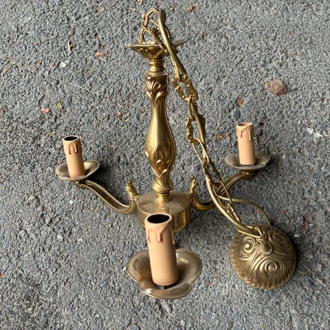 Pronssi kruunu 6 haarainen . Mitat : halkaisija 58 cm h= 45 cm + ketju ja kuppi 28 cm . HP 120 € + pk/ nouto Tampereelta, sopimuksen mukaan.