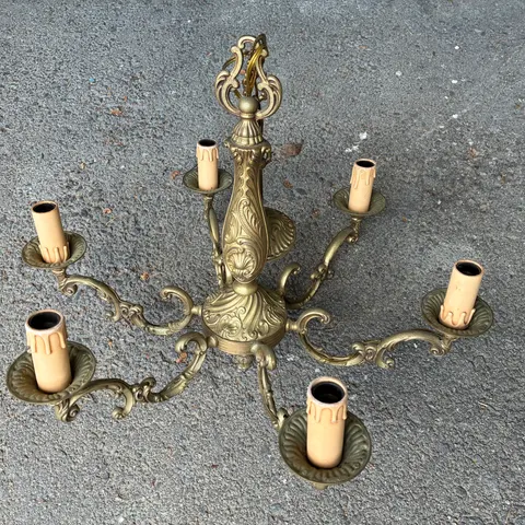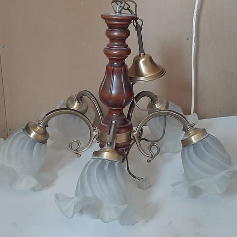 Pieni pronssi kruunu, 3 haarainen. Mitat : Halkaisija 35 cm h=35 cm + ketju ja kuppi 48 cm. HP 60 € + pk/nouto Tampereelta, sopimuksen mukaan.