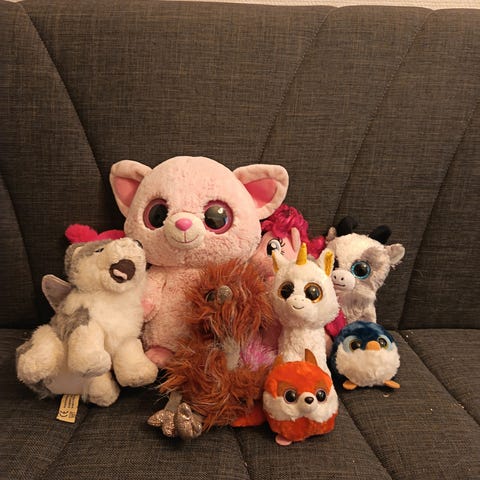 Myynnissä sekalainen setti huvipuistoista ja muista voitettuja pieniä pehmoleluja. Kunto leikitty hyvä. Ehjä ja siisti, hajuton ja savuton. Toisella delfiinillä kuonossa reikä. Koko keskimäärin noin 17cm paitsi pari pienempää.