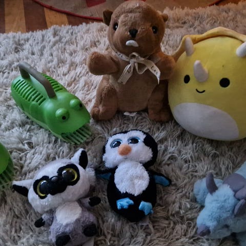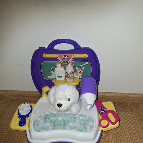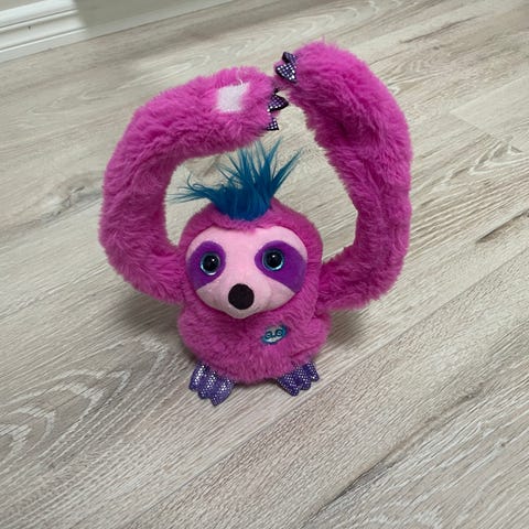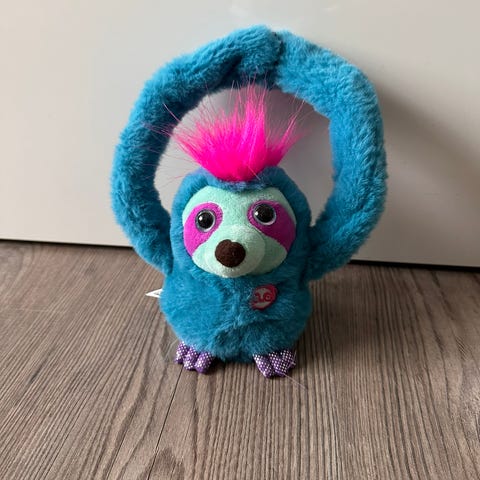 Käsivarsiensa varassa musiikin tahdissa pyörivä pehmo laiskiainen. Turkoosi, pörröinen, glitterisilmäinen. Hyvässä kunnossa, toimii kolmella AAA-sormiparistolla. Merkki Party Pets.