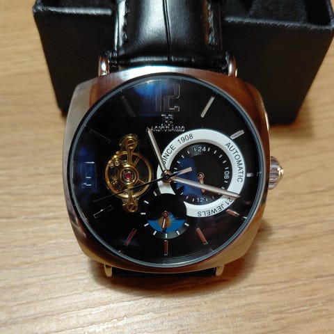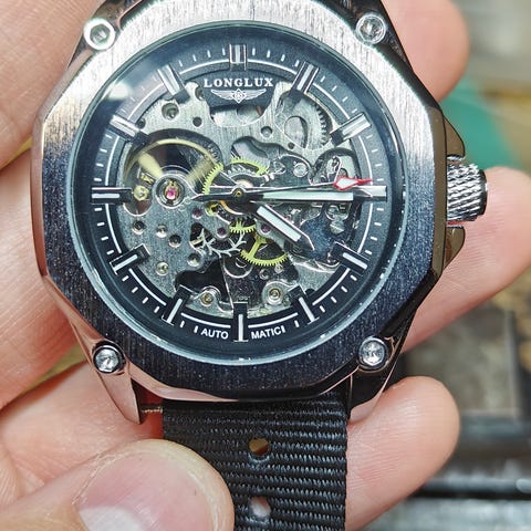 Todella hyvässä kunnossa oleva automaattikello. Mukana tulee lisälaattoja, joilla rannekkeesta saa oman kokoisen.