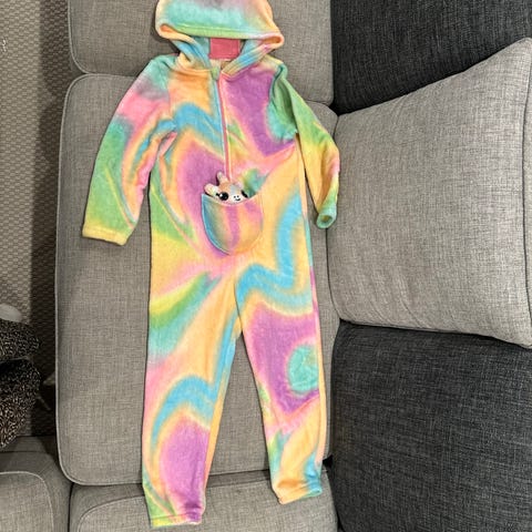 Söpö valkoinen haalari/oloasu sydänkuvioilla. Hupussa pienet korvat. Käden- ja jalansuissa resorit.