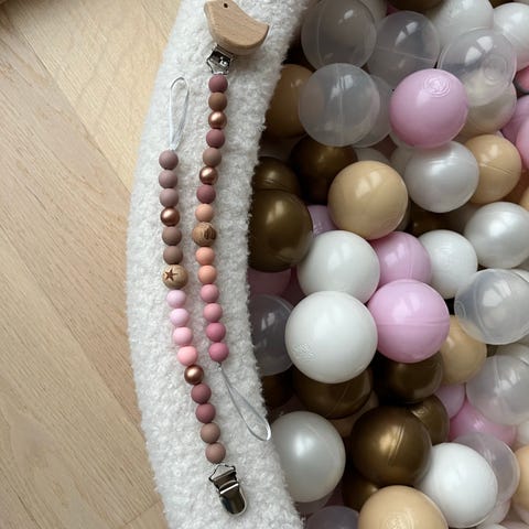 Mukana Nattou-, Liewood-, nahkainen Baby Wallaby-, Mylo-, Mam- ja Emma -tuttinauhat. Mukaan saa myös Bibsin uuden tutin (Bibs Supreme silikonisena, kokoa 1.)