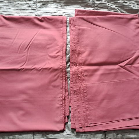 Koko n. 150 x 160 cm. Väri vastaa enemmän ruusua, mutta taittaa ehkä aavistuksen aprikoosiin. Saattaa olla itsetehdyt🤔 Verhoissa molemmissa tankopaikka. Sauma vähän vinoon ommeltu ja joitakin pieniä langan nousuja sekä käytön jälkiä löytyy. Hyvä, käytetty kunto.