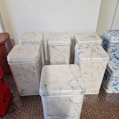 Marimekko "Aatto" peltipurkit, design Fujiwo Ishimoto. Kuvassa purkit nro.3
