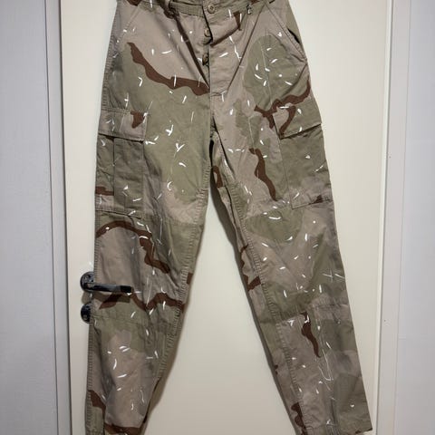Käytetyt armeijan maastohousut. Koko M, vyötärö n. 84 cm, lahkeen sisäpituus n. 82 cm.