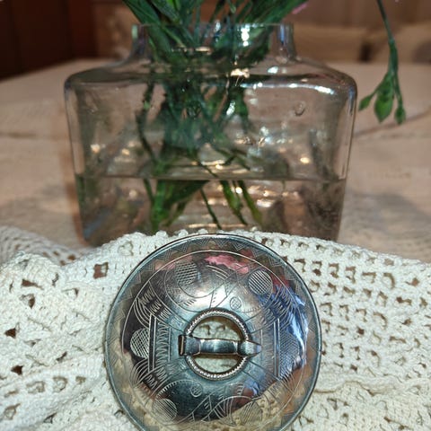 En tiedä materiaalia onko hopeaa vai pronssia tms? Soljessa kruunun kuva.