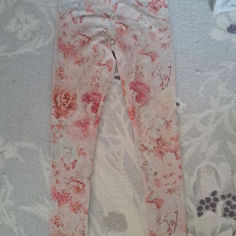 Kaupanpäälle valkoiset 128cm printtileggarit, joista paikattu polvea.