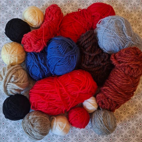 Sekalainen kokoelma lankoja mm. Puuvillalankaa, villasekoitelankoja ja iso kerä merseroitua virkkauslankaa.